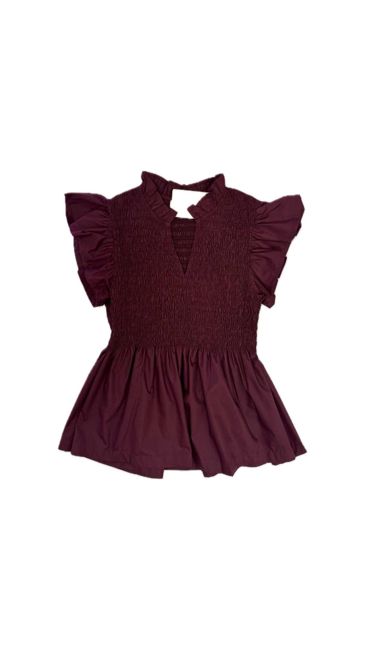 Solid flutter sleeve peplum top featuring smocked bodice and ruffled split neckline. Unlined. Woven. Non-sheer. Lightweight.