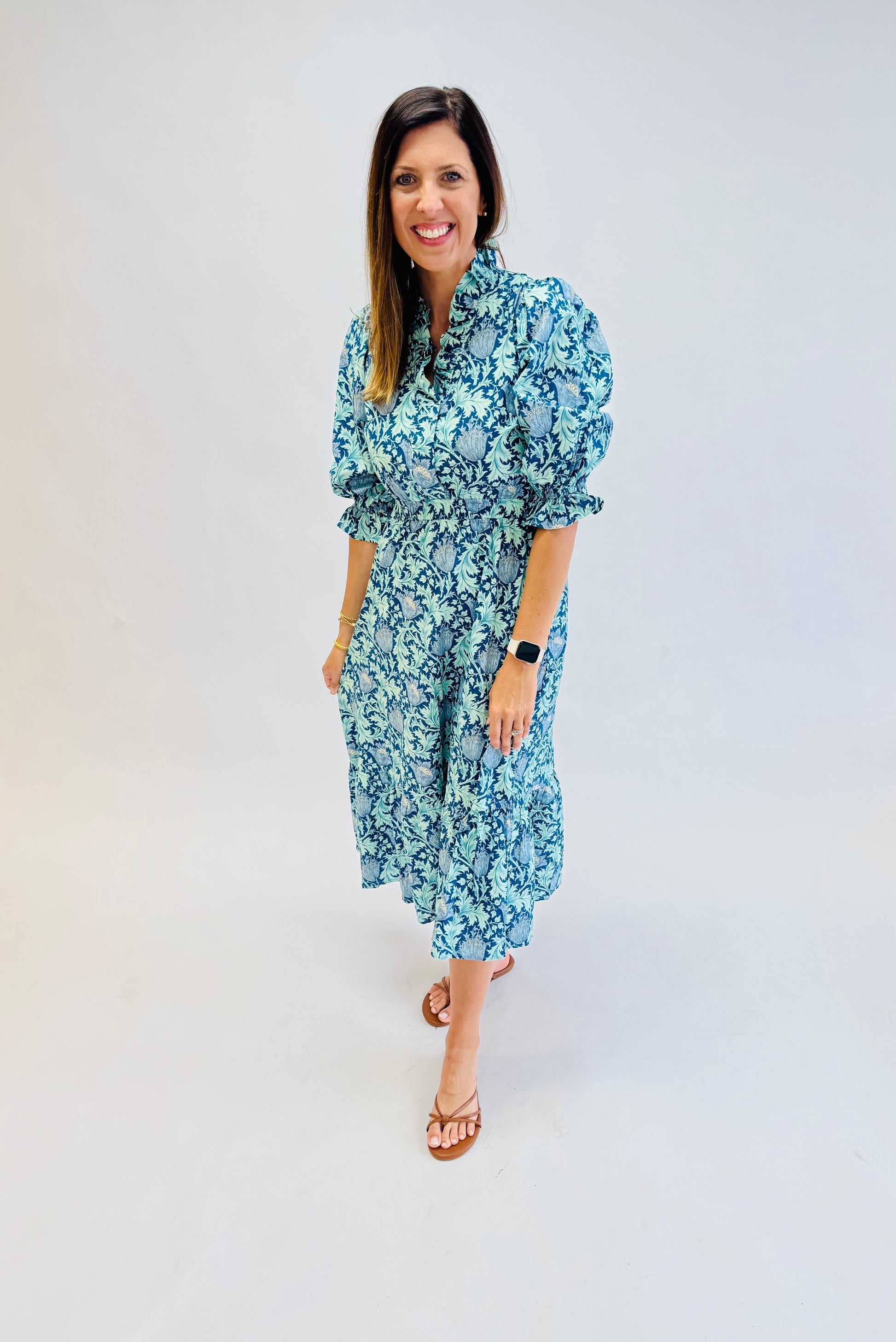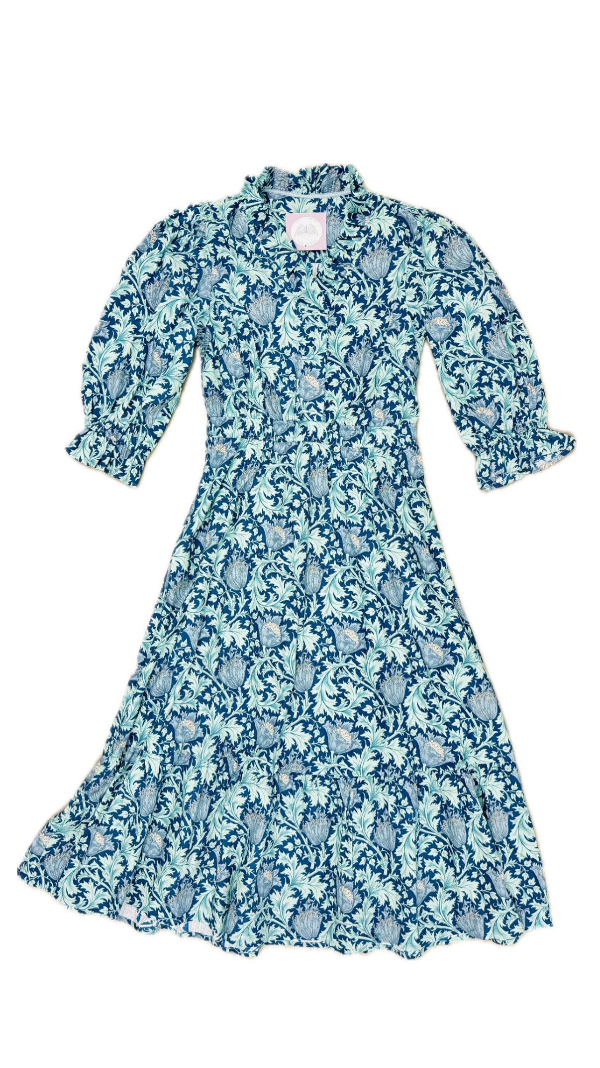 V-neck with stand collar, 3/4 length with elastic ruffle cuffs, elasticized, midi length with subtle tiered flare, not lined.