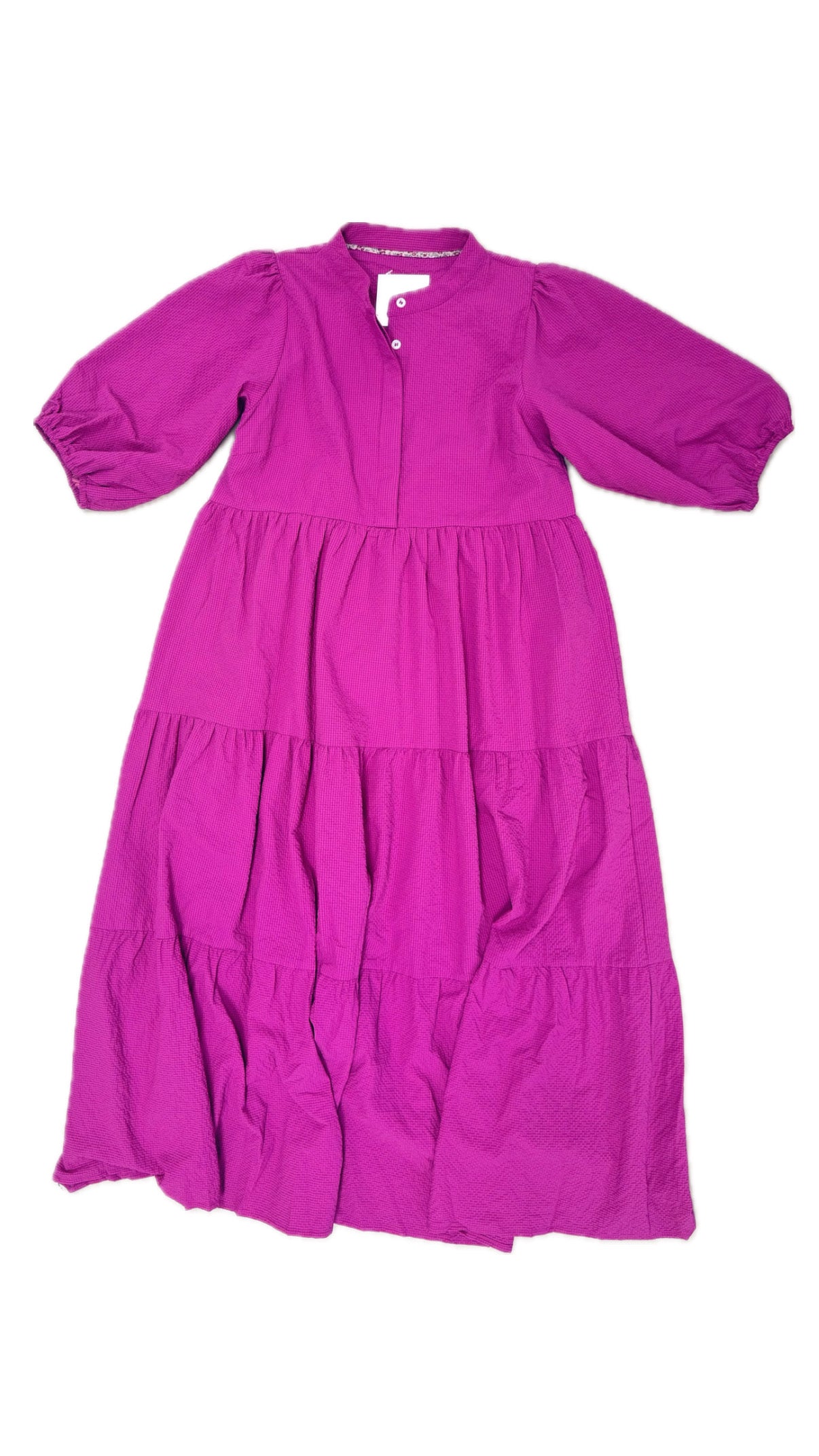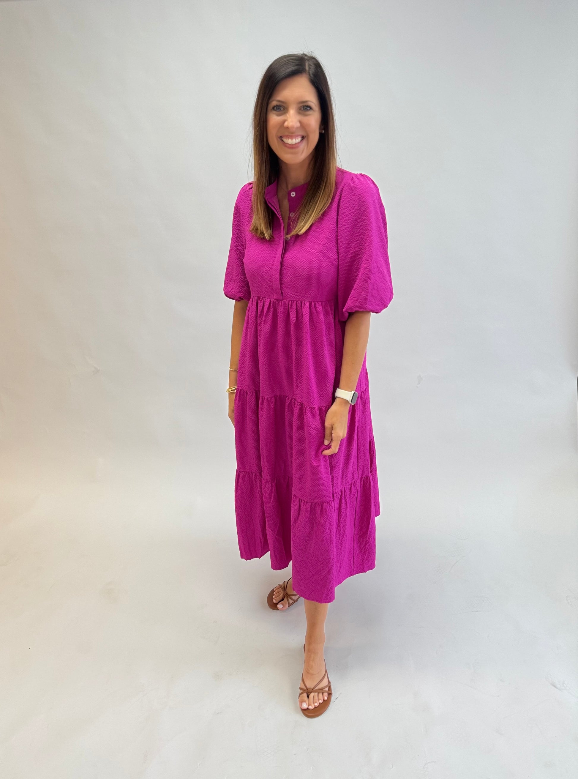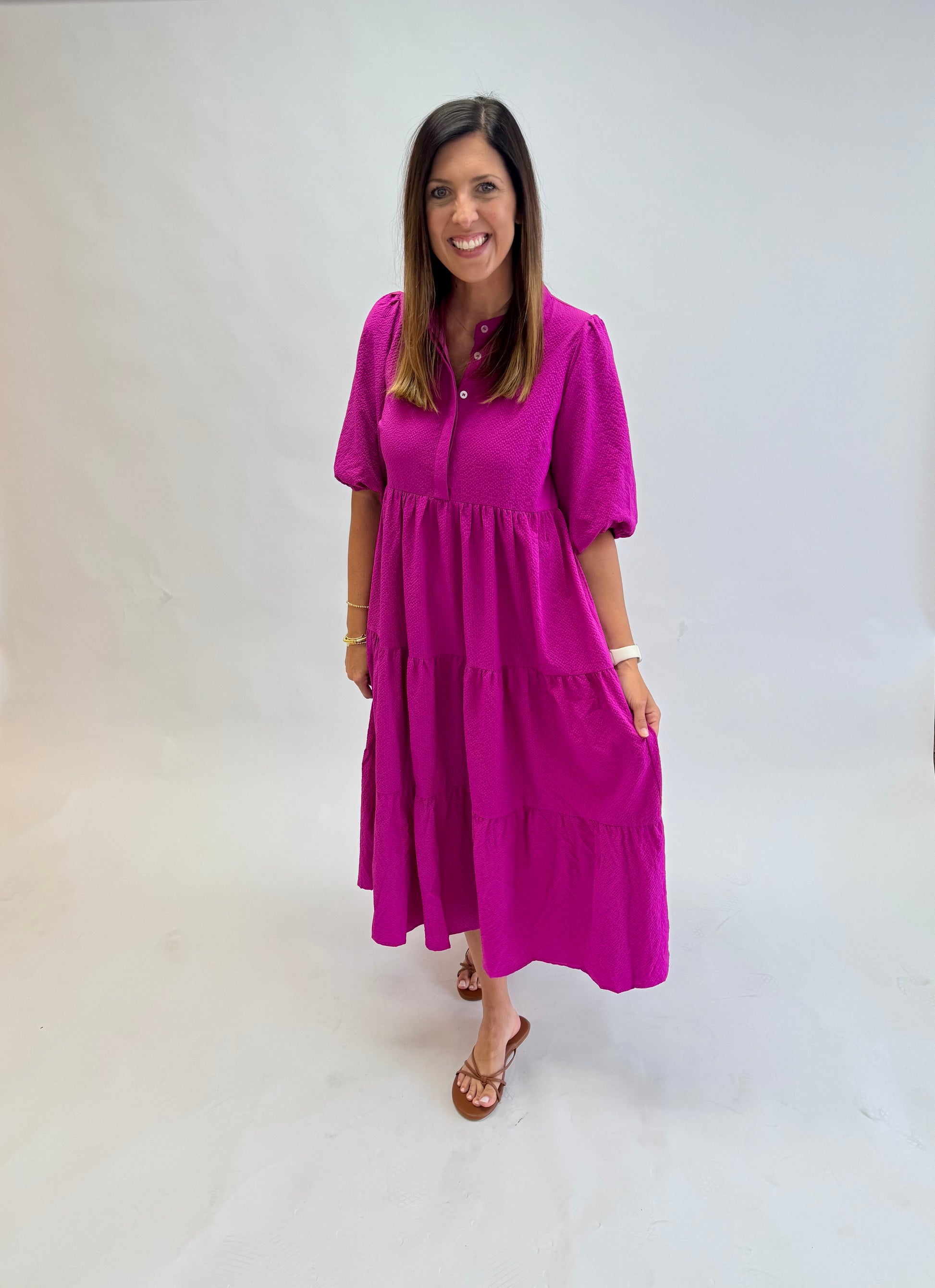 Textured, hidden placket, tiered midi-length, mandarin collar, lined